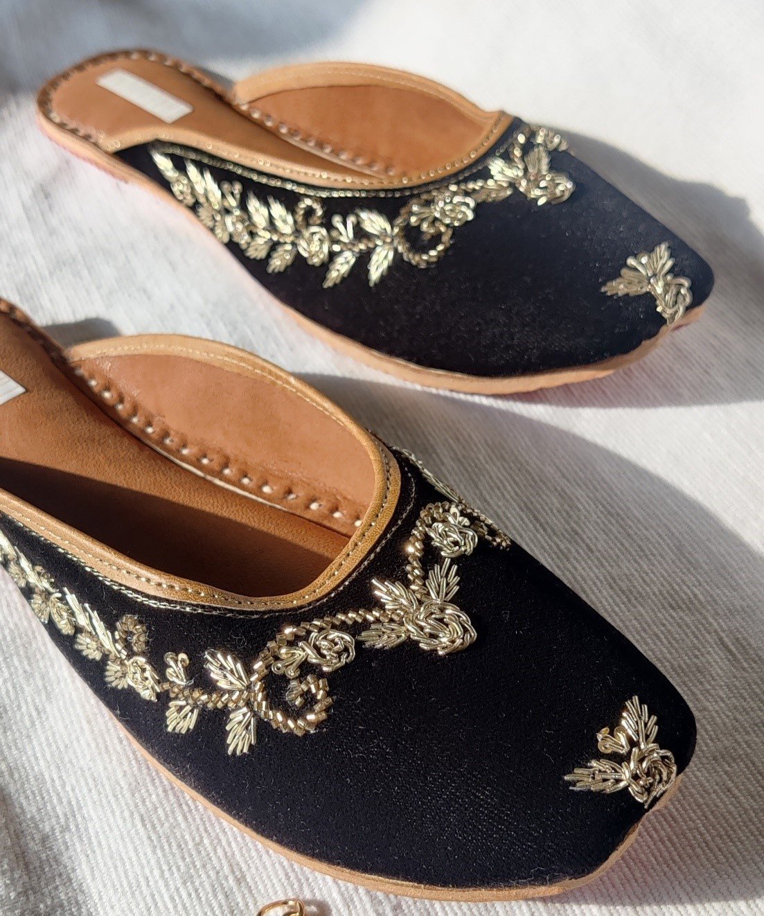 Uber elegant gold zardozi bel with hints of gleaming sequin and delicate florals wrapped around the front of the Back Open jutti! The minamilism of the embroidery on the glossy, rich velvet makes this jutti, a really striking one! Its made for the real princess in you!