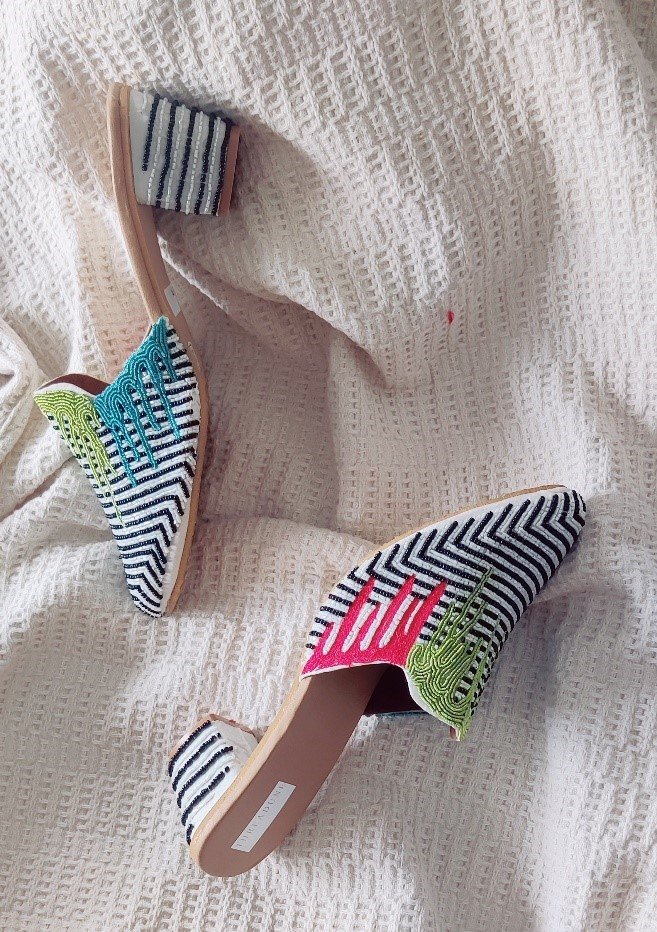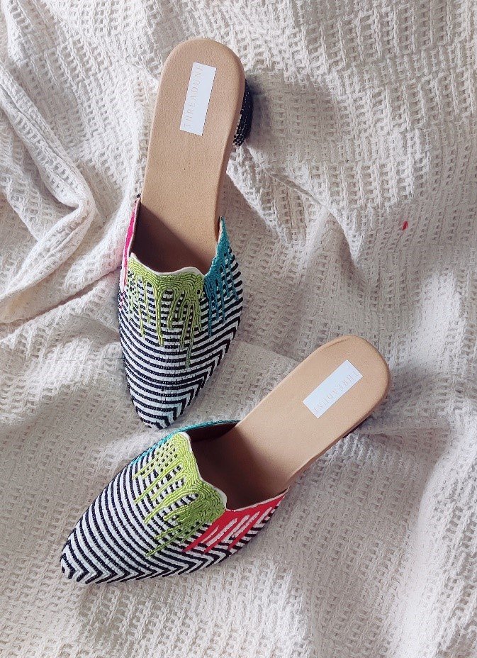 When monochrome meets pop, it becomes a work of art! An impactful base of lusturous ivory and black beads overlayered with multicolour paint dripping effect achieved in turquoise, neon, green and metallic gold. If youre a shoe lover,we’ve created something that you will truly cherish.