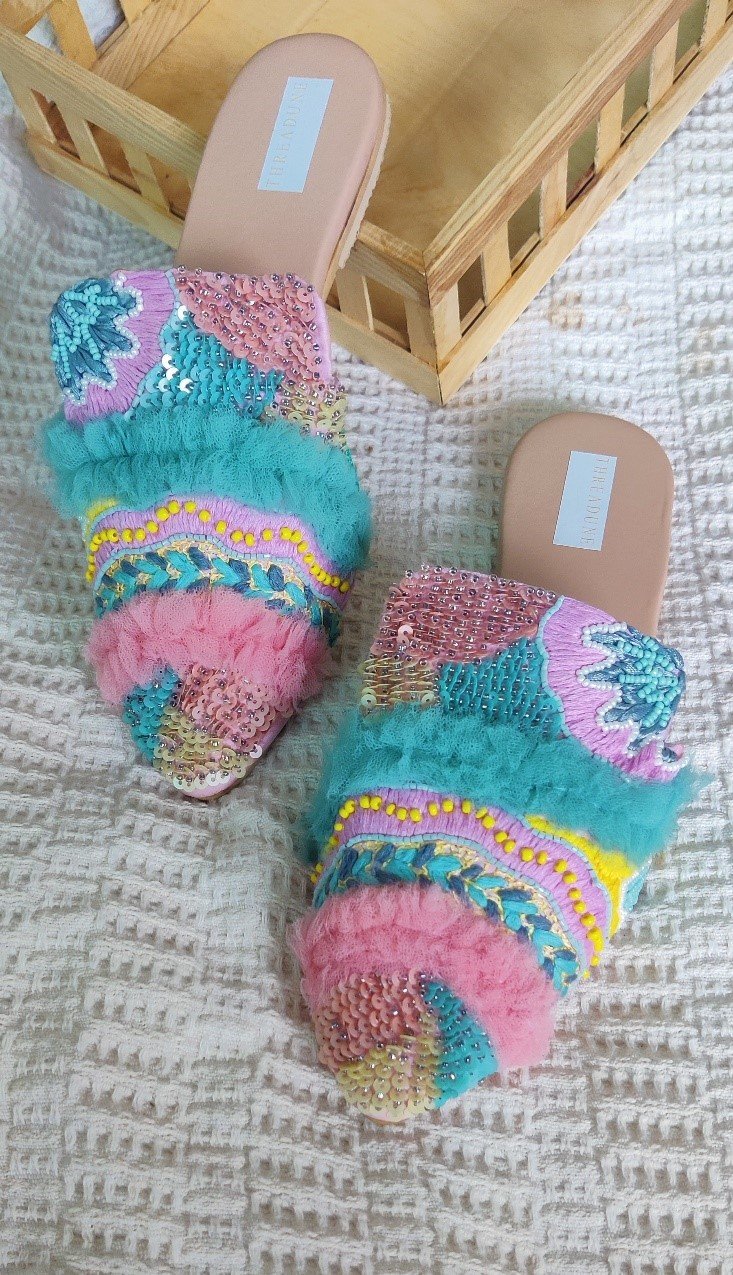 This summer slay with your “M E R I A H” MULES handcrafted with pastel shade ruffles and Sitara work on the vamp perfect for summers.