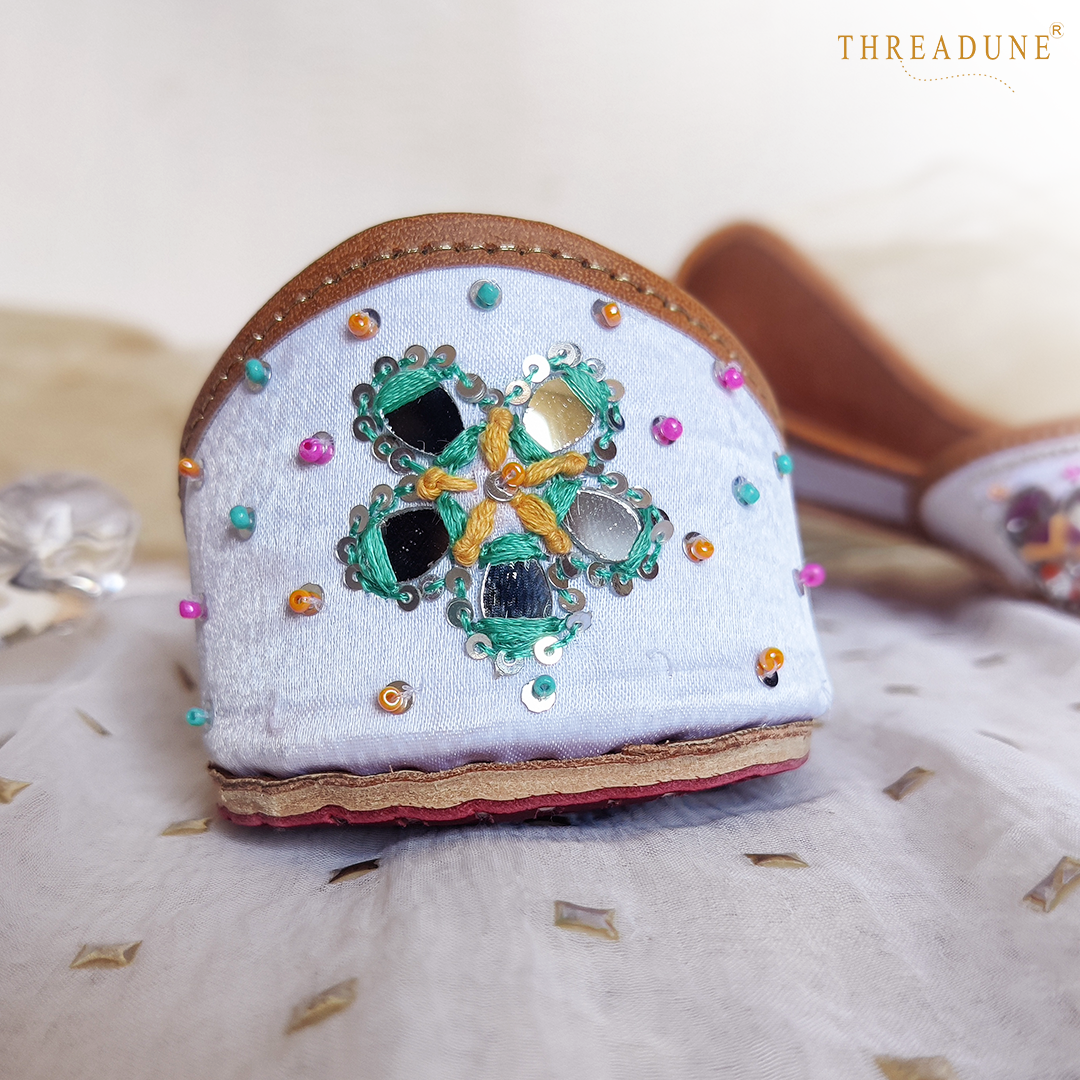 A beautiful blend of blooming mirror blooming floral colours hand embroided with threads , gleaming silver beads and sequin! All our juttis are handstiched and embroided with all love and your comfort!!