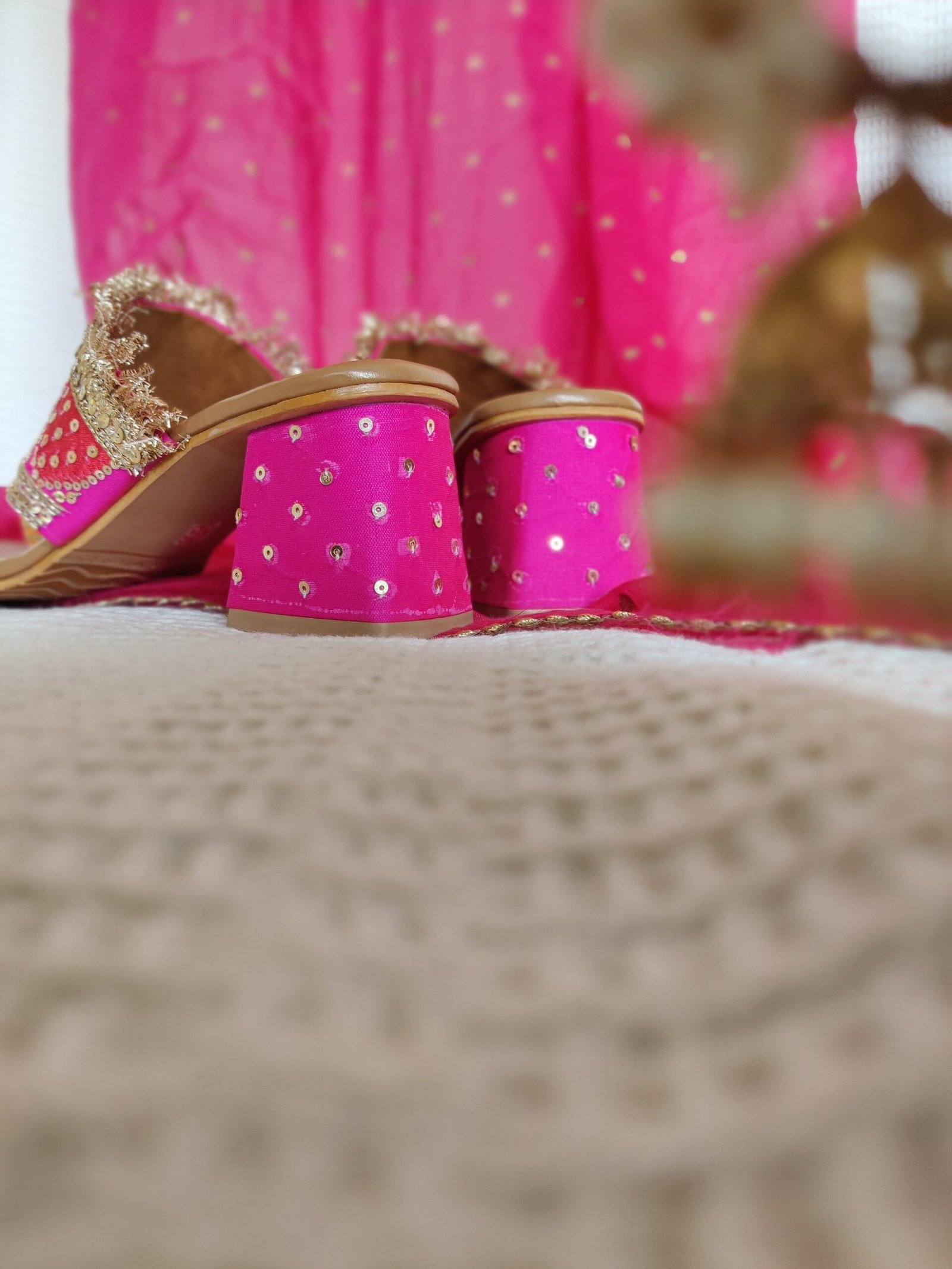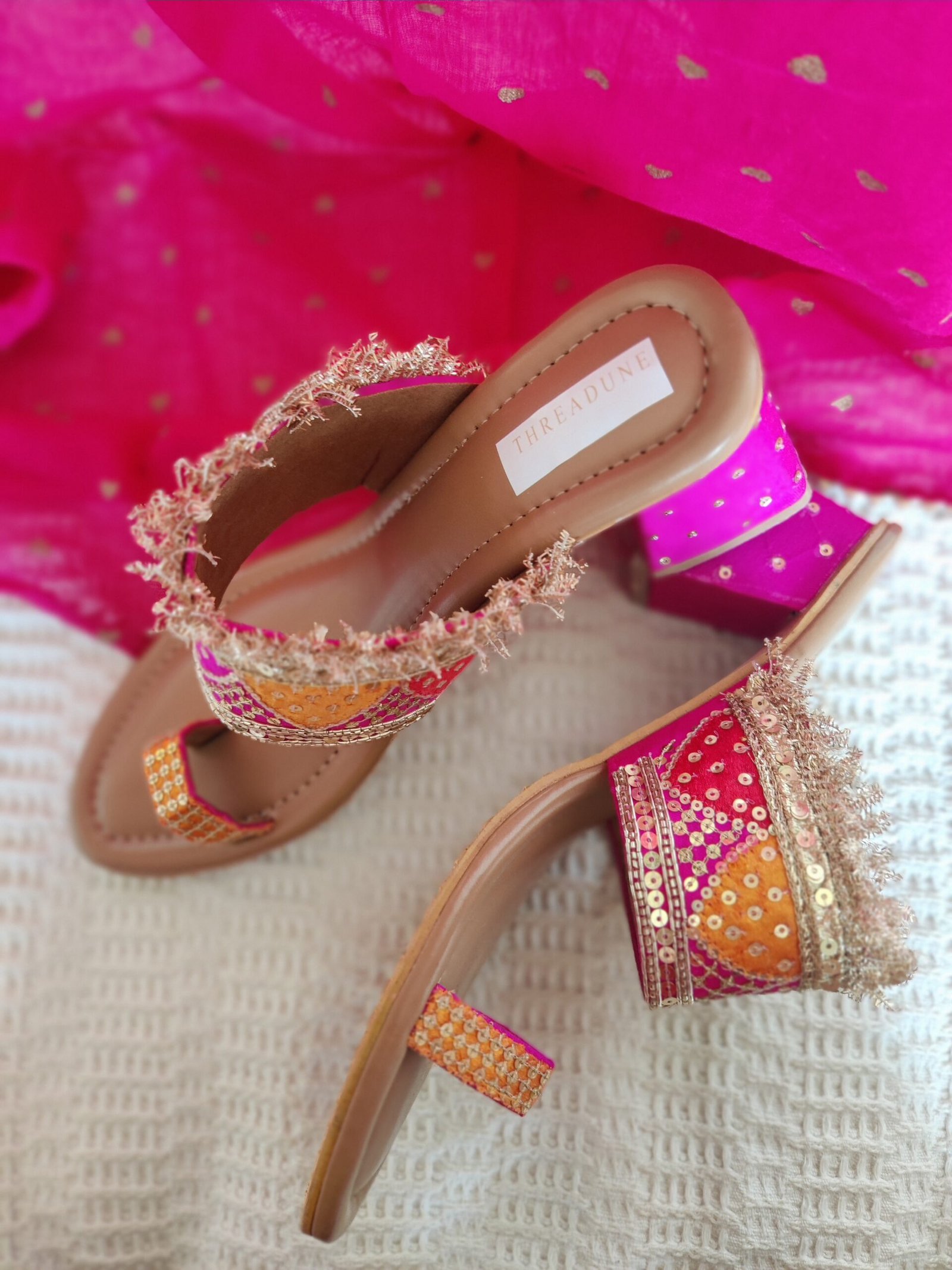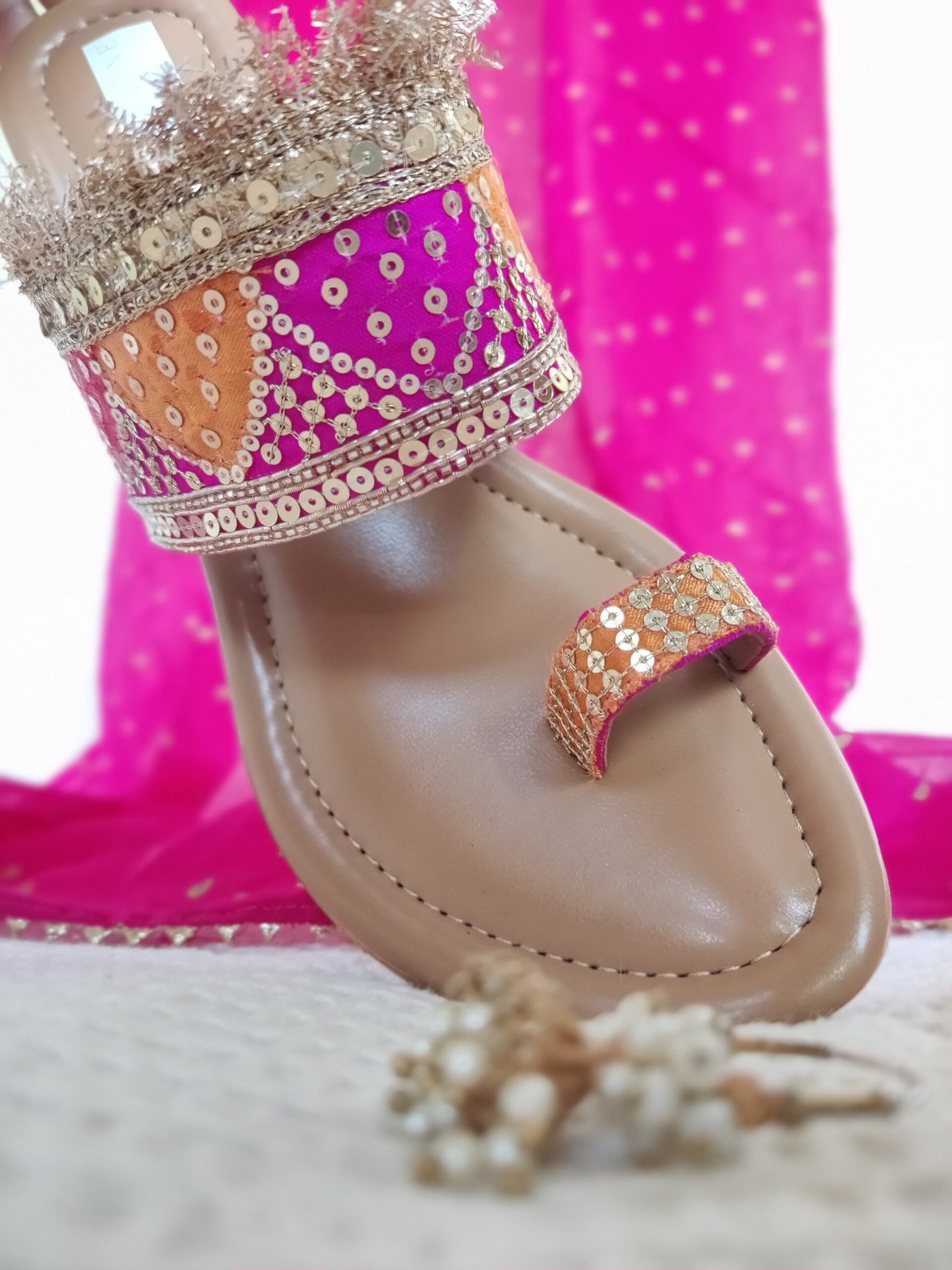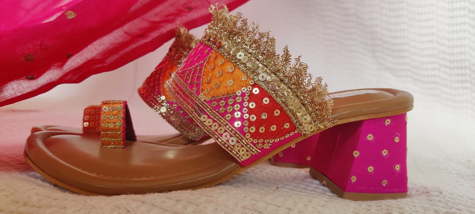 Your perfect festive/wedding kolhapuri heell, handcrafted in celebratory colours of rani pink, gulaabi red and marigold orange with intricate gold zari and sequin work! The strap is further accentuated with a stunning gold zari fringe to add that touch of extra sparkle to your special shoe.